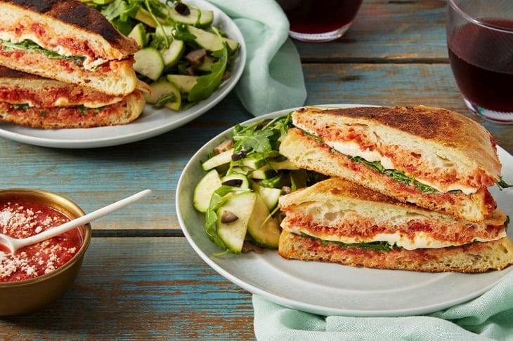 The next night, I got home a little late. My wonderful boyfriend had already started cooking our next meal (proving that he’s definitely a keeper): Mozzarella and Arugula Paninis with a fresh Marinated Summer Squash and Olive Salad. This is a guy who’s idea of cooking is opening a can of Chef Boyardee, but he really had fun following the recipe. The result? Warm and melty paninis with a crisp and delicious salad.