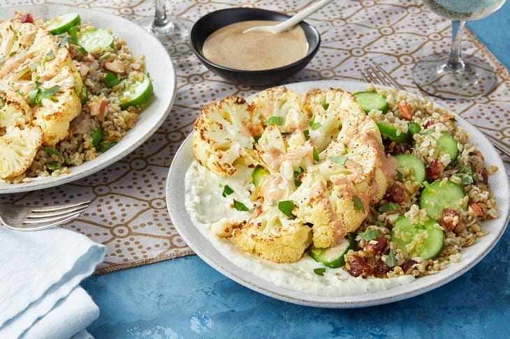 We skipped the following night because we had plans to dine out with friends. The night after, we settled down to make the final Blue Apron meal in our box: a Roasted Cauliflower and Freekeh Salad with Lemon-Yogurt Sauce and Spiced Tahini Dressing. I had never heard of freekeh and thought it sounded, well, freaky. For those who are also new to this mystery ingredient, it turns out that freekeh is a young-harvested wheat that’s toasted. It made a truly tasty base for the salad, which was topped off with roasted cauliflower, roasted almonds, dates, cucumber, and addictive yogurt lemon sauce (this stuff would taste great on everything) and spiced tahini dressing.