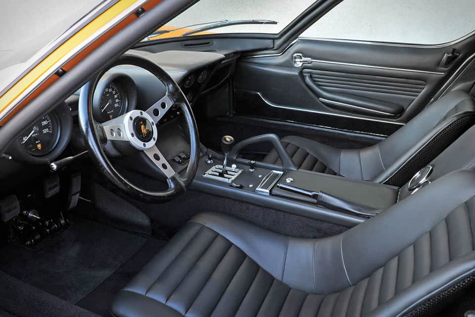 The 1972 Miura SV is the more desirable model of the SV line, as it was the later model year and featured improvements such as bigger carburetors, tweaked suspension and wider rear body for better handling. The car is powered by the naturally aspirated mid-mounted 3,929cc V12 engine producing 385 bhp, sending power to the rear wheels via a 5-speed manual gearbox.