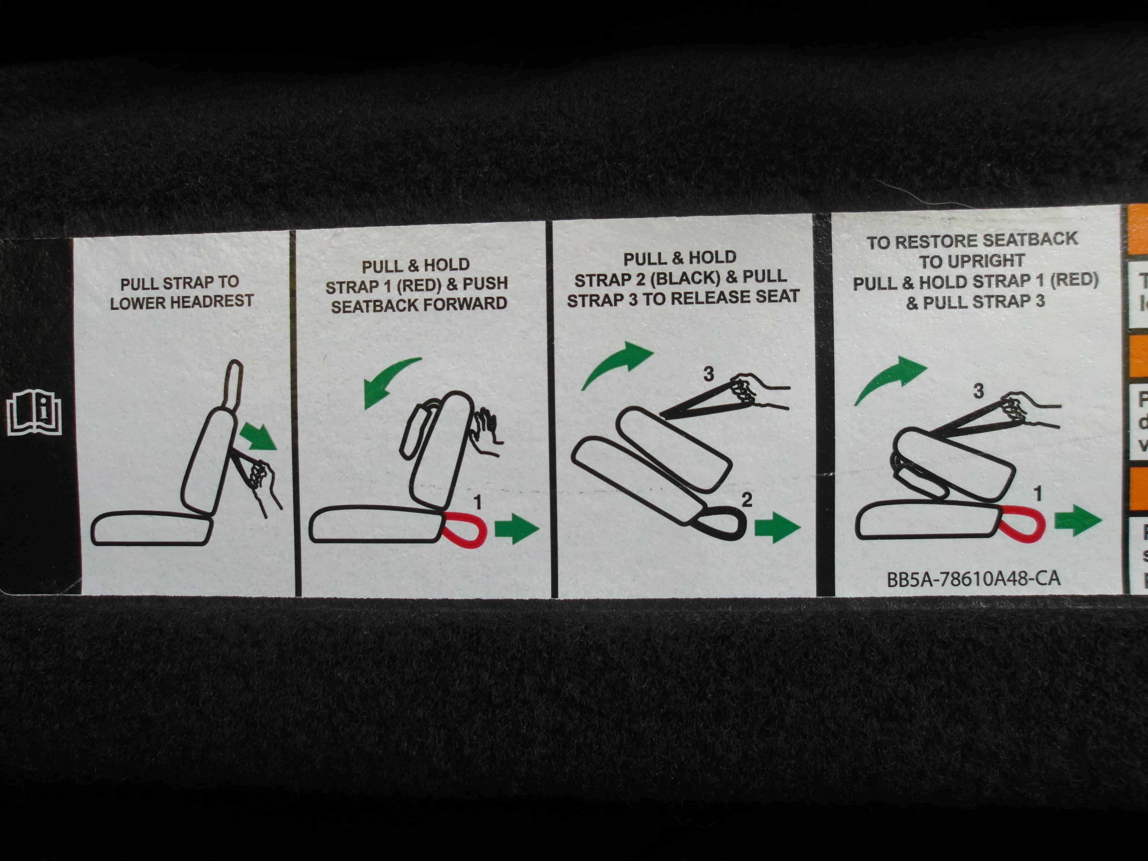 The interior is very comfortable with bolstered leather seats for the front passengers that are heated and cooled; the driver gets a 10-way power seat with lumbar and the passenger gets 6-way power seat with lumbar. The 2nd row seats three people and the 3rd row has seats for two, there is enough space for shorter passengers but taller people (6’+) might find it a bit cramped. The 3rd row seats fold into the floor quite easily (if not equipped with auto-folding seats) with the pulling of a few straps and following directions outlined on the seats (click on the image above). Once the seats are folded, there is lots of room to put your stuff in.