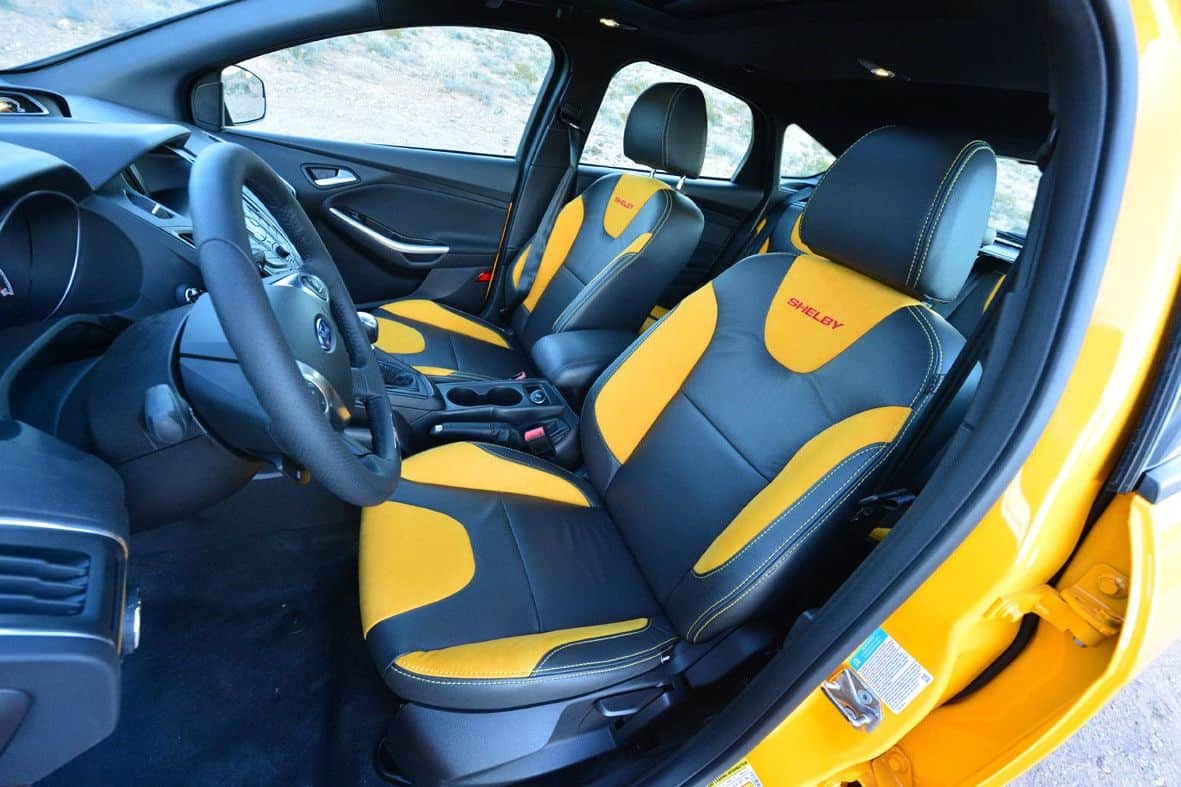 Okay, so the Shelby package is a little more than stickers but still not worth the money in my opinion. And speaking of stickers, the Shelby package offers three graphic visual options such as the traditional Shelby stripes, competition decals, or Shelby checkered flag splash. The Shelby Ford Focus ST also receives a functional vented hood, front and rear grill inserts, Shelby lettering, and a hydro-carbon rear spoiler. The interior of the vehicle gets a Shelby branded custom interior which includes a unique shifter and a Shelby CSM badge.