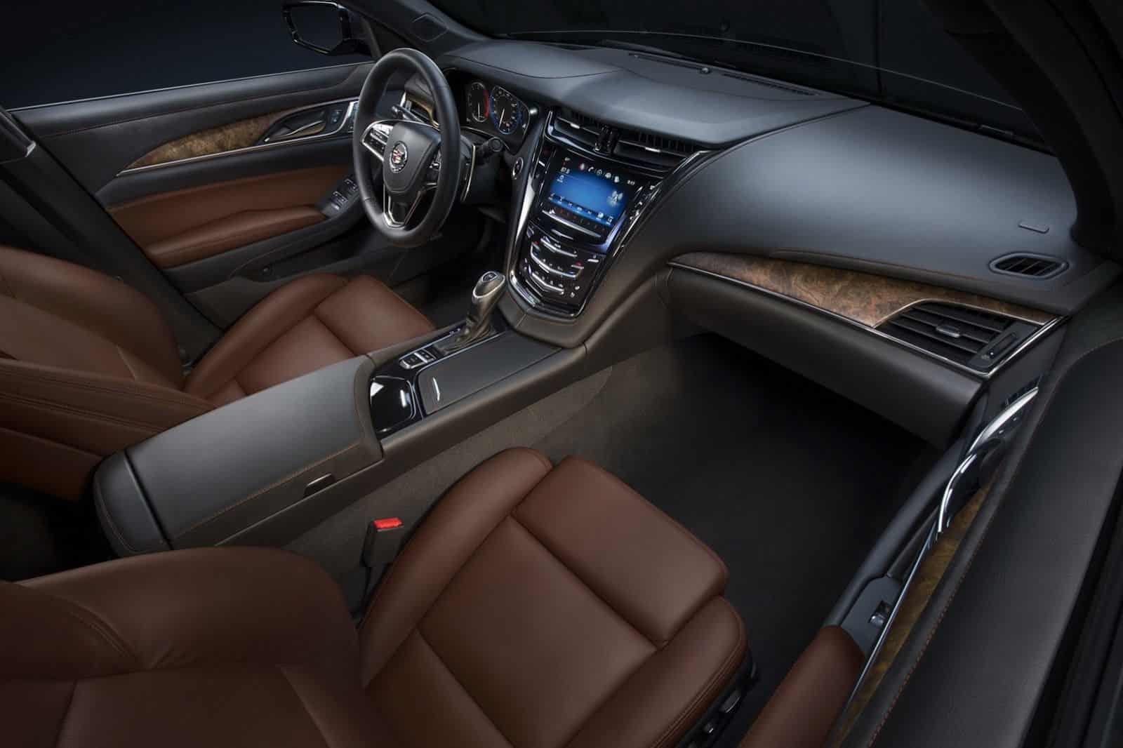 The interior on the 2014 Cadillac CTS is pretty posh; it is a Cadillac after all. The interior features lots of soft-touch materials on the dashboard, center console, and door panels; there is wood trim on the dashboard and door panels, and clean layout of buttons and a touch screen on the center stack. Via: Cadillac