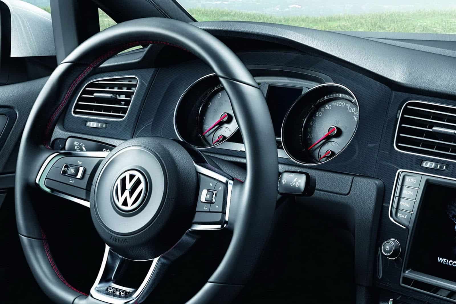 The interior should be similar to the previous generation of the Golf GTI with the base model featuring the classic tartan pattern fabric for the sport seats, black headliner, flat bottom steering wheel, and red ambient interior lighting.