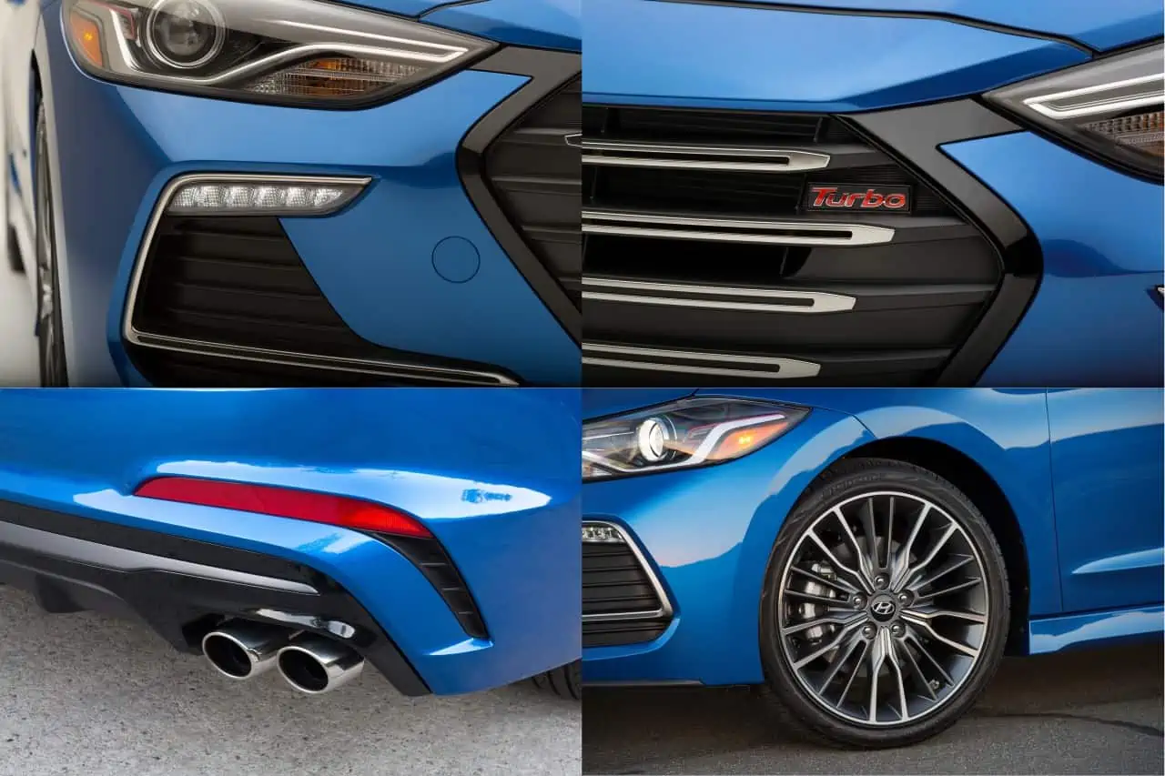 My first impressions of the 2017 Hyundai Elantra Sport were very positive, the car looks fantastic in blue. The Sport trim gets side skirts, which add to the sporty look of the car, it also comes with Sport trim exclusive 18” wheels, a black chrome grill at the front with “Turbo” in red letters, dual-tip exhaust and faux diffuser at the back. The car comes with standard HID headlights with black inner housing, horizontally mounted LED daytime running lights, and LED taillights.