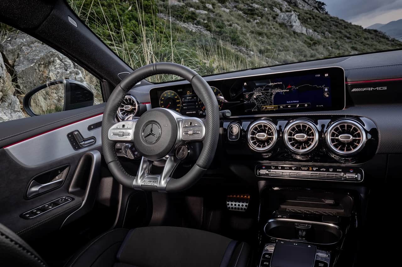 The Mercedes AMG A35 comes upgraded chassis and a stiffer body, adaptive suspension, and bigger brakes. The A35 will also come with an aero kit, that not only makes the A35 look more aggressive, but also improves high speed stability.