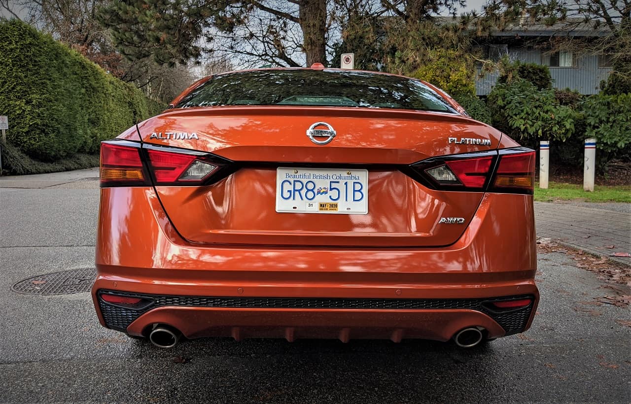 I think the 2020 Nissan Altima is a pretty decent looking car. Taste in styling is subjective; some might hate the “floating pillar” treatment on the c-pillar of the Altima, I personally didn’t mind it. The overall styling is modern, it’s interesting looking but not over the top. The front features a very large grill (some of which is blocked off) with a chrome “V-Motion” grill and sharp looking LED headlights (standard on the SV and Platinum trims). The side profile is clean with a few body lines giving it more character, the rear end features dual exhaust tips, a diffuser looking thing, and sharp looking taillights. Our review car came with 19” rims (16” and 17” wheels are standard on the two lower trims), which looked good on our brightly colored orange (officially called Sunset Drift) car.