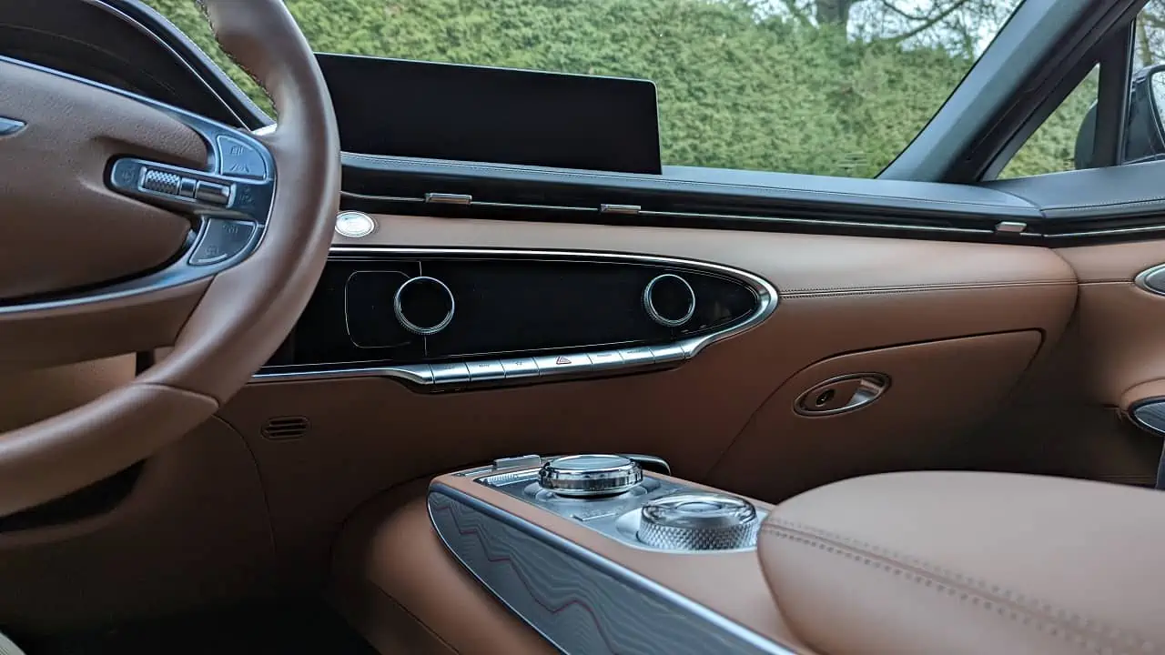 The interior is also the same on the smaller engine (less expensive) GV70. However, our 2.5T Advanced+ was equipped with brown (non-Nappa) leather. You can choose between a wide variety of interior leather colors, depending on the trim and exterior color. I quite like the “Pine Grove Leather” (not equipped on our car), which looks green. I’m not sure how it would look in person, but in pictures it looks quite interesting. The other difference is in the trim on the doors and center console. I don’t really know what material it is, but it’s kind of funky and different. Our previous review GV70 had this material in carbon fiber, which looked quite good with the read interior.