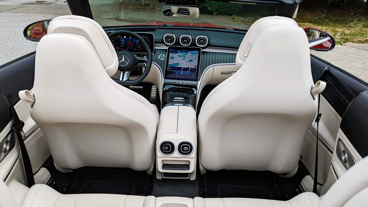 Rear seat legroom runs tight in the 2025 Mercedes-Benz CLE 300 4MATIC Cabriolet. Technically, four people can fit int he car, but those rear seats work better as backup than main seating or for children; my two kids absolutely loved the car. Most grown men will find the fit back there cramped after even short rides. The convertible stays practical by letting you use the rear bench for bags or gear when you don’t have extra passengers.