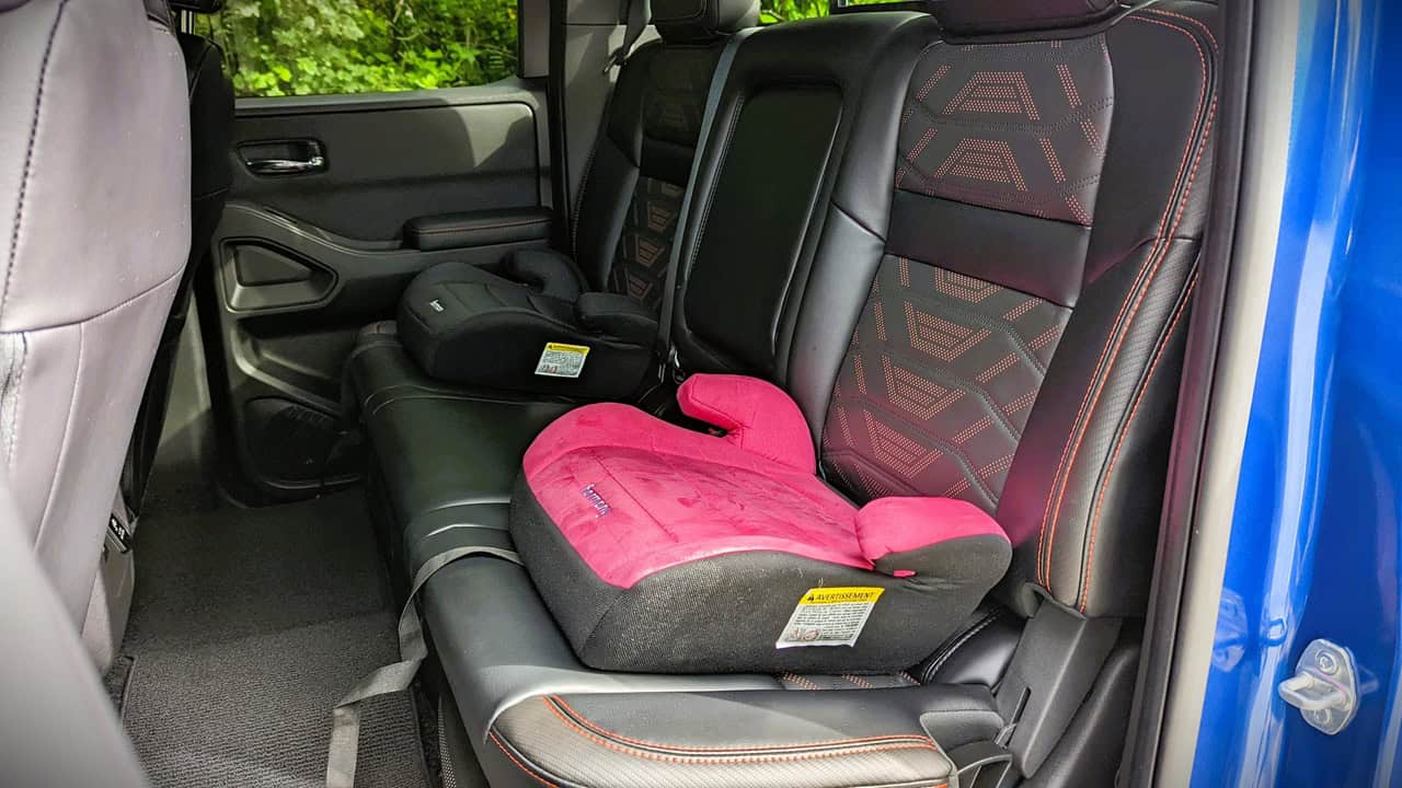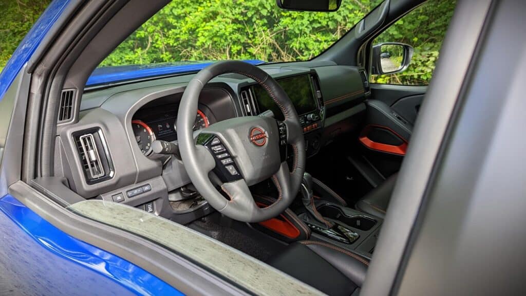 The 2025 Frontier’s cabin strikes a perfect balance between comfort and practicality. Red trim and stitching add a sporty touch to the interior, while the telescoping steering wheel lets me adjust my driving position with ease.