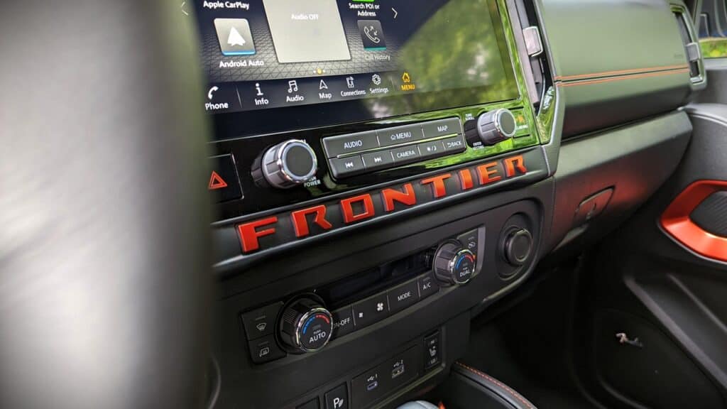The screen graphics look sharp and modern, not like those old clunky truck displays from past Frontiers. Small touches like physical knobs for volume and tuning make quick adjustments safer while driving.