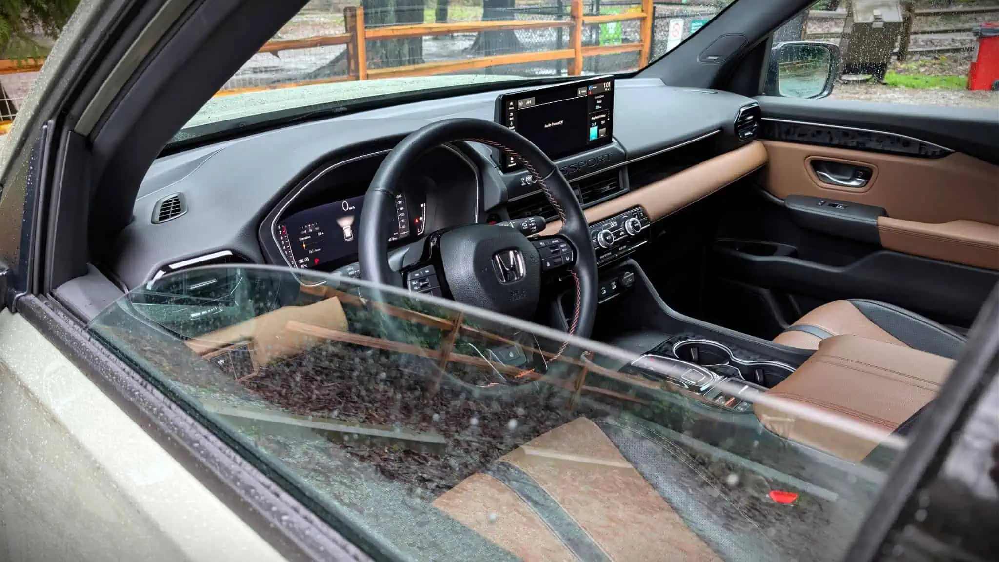 The 2026 Honda Passport TrailSport Touring feels huge inside, thanks to wide-opening doors and a bright, airy cabin helped by the panoramic sunroof. Black and tan dash colors pop with orange accents specific to the TrailSport trim.