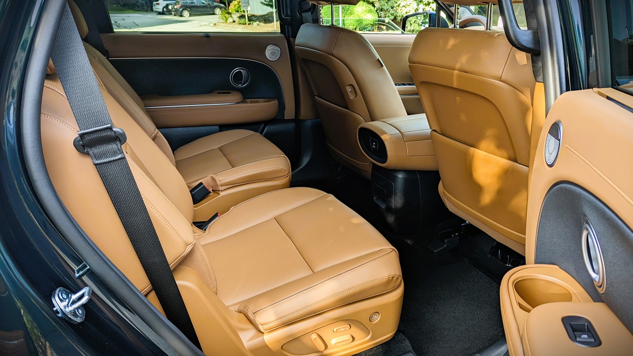 The three rows fit up to eight people in the 2026 Palisade Ultimate Calligraphy. The third row slides back an extra 1.5 inches, giving passengers 33.6 inches of legroom. Power controls let you fold and move the last row with one button. Adults can sit back there comfortably since the ceiling stays high enough.