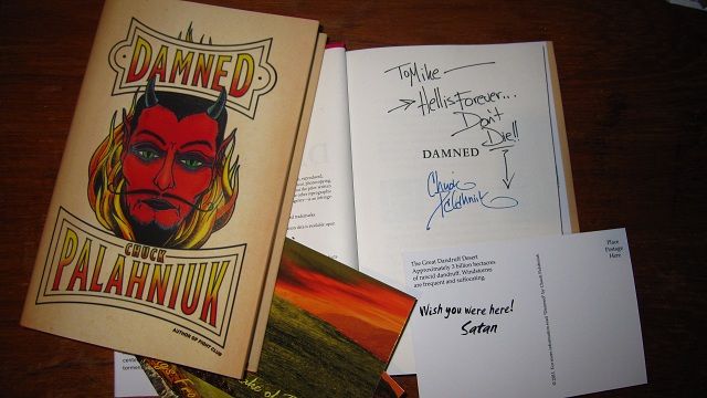 Being one of the lucky few who got the chance to get the book/signing/ticket package for only $35, I arrived a few hours early before the show started to pick up my book and meet Chuck. The book, Damned, is about a 13 year old girl who ‘overdoses’ on marijuana and has to make due in her afterlife in hell. I haven’t read it but I’m already trying to race through this article to get a decent start on it. One of the first things I did notice though is that the book’s dust cover eerily looks and, especially, feels like human skin with the added touch of the raised print on the tattoo of Satan.