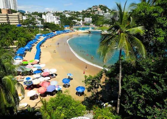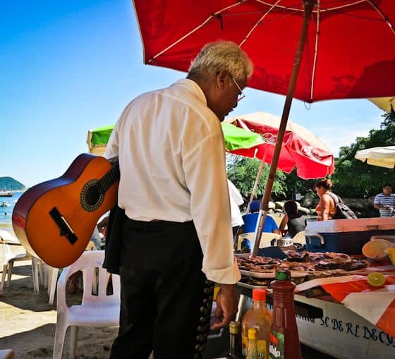 I am thirsty from lazing around in my beach chair and drinking in the bright sun reflecting off Acapulco Bay, a semi-circular bay used as a trading hub since early in Mexico’s colonial history. I order water from my fish ceviche vendor. He only has curves and coke but tells me to wait a minute. I see him run down the beach to a neighboring vendor and grab a water bottle from his styrofoam cooler. The ceviche is average with an orange citrus twist, but a mariachi musician decked out in his flashy black clothes (he has to be hot), and guitar takes a seat next to me and orders the same thing. We exchange pleasantries.
