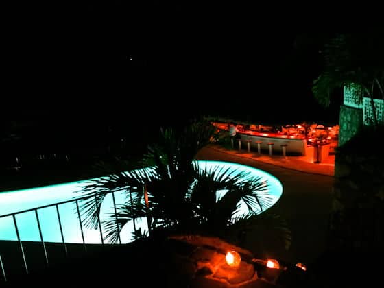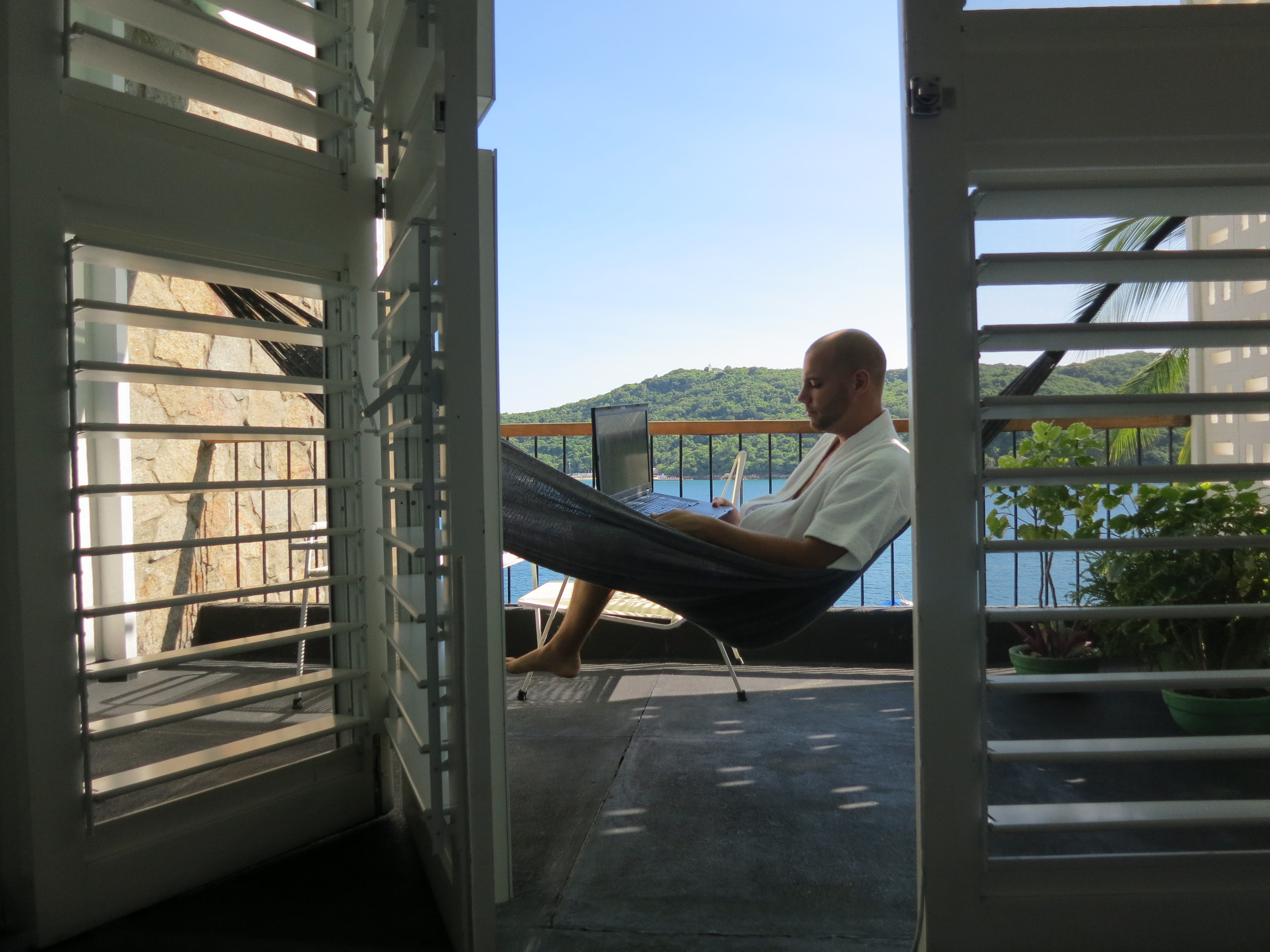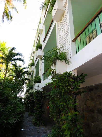 I am penning this from the room’s shaded hammock on my hotel’s private terrace in front of all-white louvered open doors, letting my room soak up the sun and breeze from Acapulco Bay. It is currently low season in Mexico, and the hotel is not busy. From where I’m sitting, I can look past the few couples kissing down below under the thatched roof restaurant by the sexy pool. I can see the jet skis and small fishing boats cruising noisily along the bay. A few people drink in the sun, but none of the drinks have umbrellas. This is an “on-the-rocks” type of place.