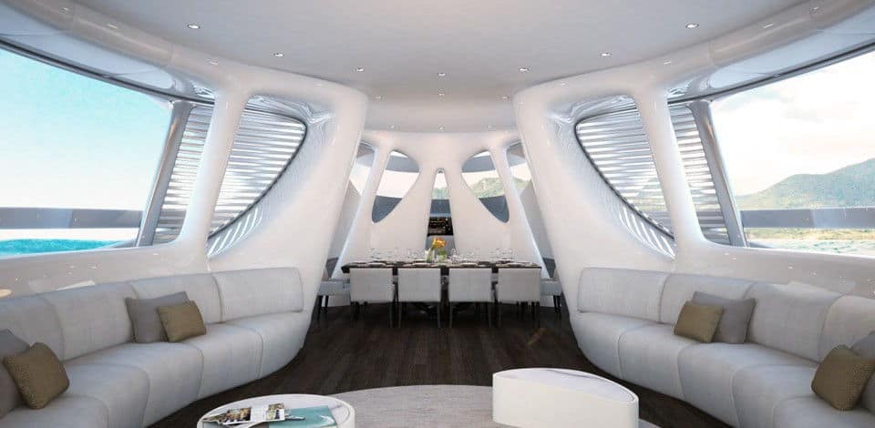 At first glance, you will notice the 130-foot long Audax 130 looks like something from the future with long swooping lines that would feel right at home on a spaceship. The sporty mega yacht is not only aesthetically pleasing from the outside but interior is just as striking and features accessories to entertain just about any adventurous sailor out there.