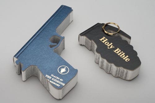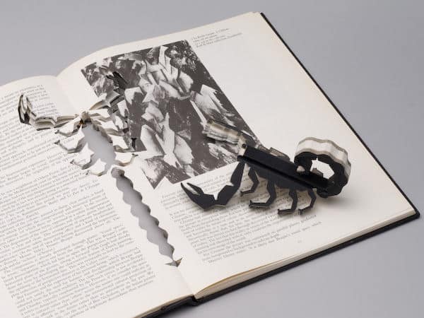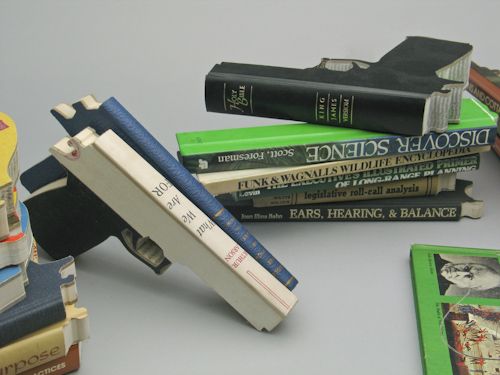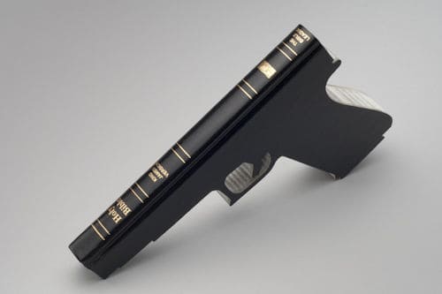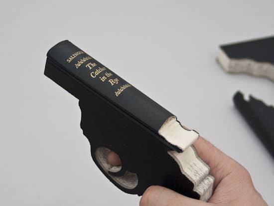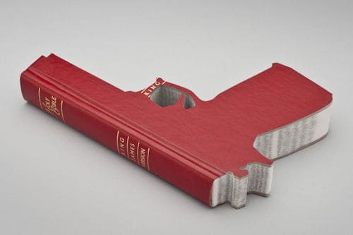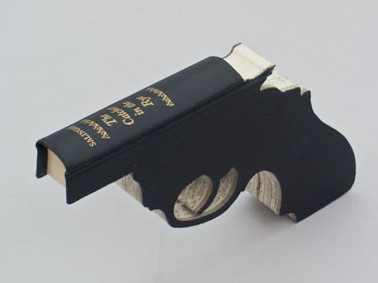 Artist Robert The started making book pieces in 1991; by 2011, he now has an amazing catalog of unique art that is the perfect fit for a man cave. Why settle for wimpy coffee table books when you can have awesome, re-constructable book art that looks like stuff that can kill you? As a guy, you should know that after reading a book and instantly absorbing all useful knowledge, you should do something manly with it, like clubbing a panther to death or propping up the Ferrari you’re working on. Check out a selection of The’s amazing works, or browse his site BookDust, for other less deadly pieces ; click through the jump for more manly adaptations to the simple hardcover novel.