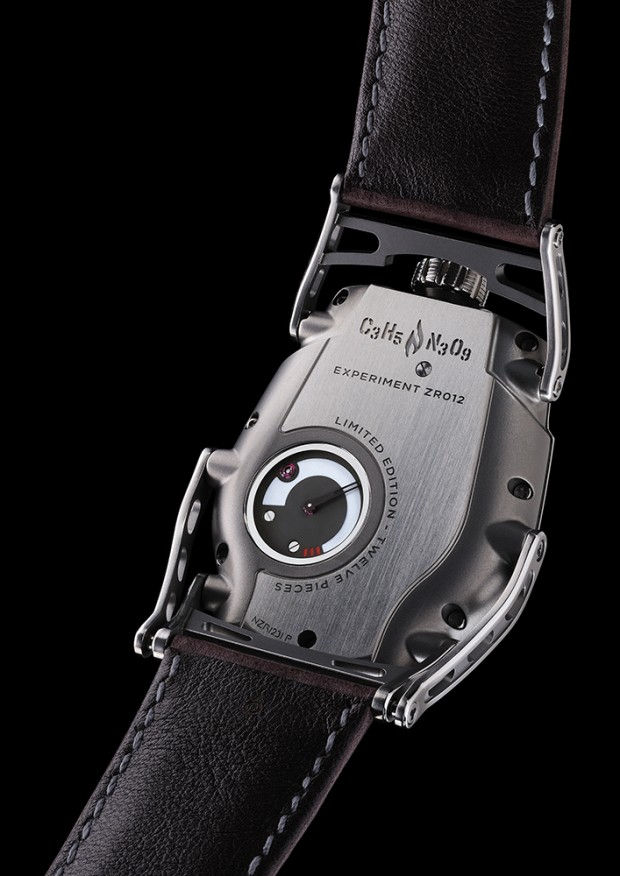 The collaboration between the two companies is, sort of, a watch brand called C3H5N3O9 – also known as nitroglycerin, the active ingredient in dynamite. The watch itself is called Experiment ZR102 and they’re calling it an “experiment” because only 12 pieces will be produced this year.