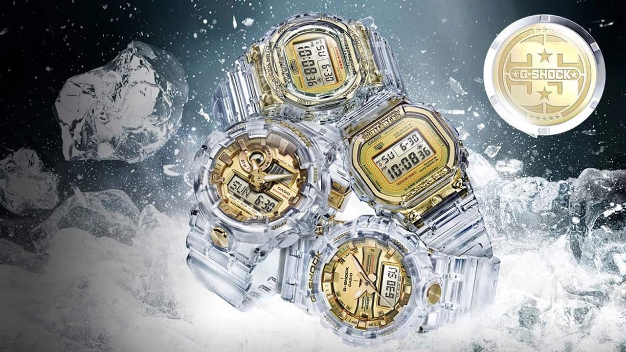 These watches feature translucent jelly cases and straps with gold highlights and dials. Through the translucent jelly case, the inner gold stainless steel case can be seen. All these watches are based on existing G-Shock models and come with some of the popular features these watches are known for, such as shock resistant bodies, multiple alarms, countdown timers, multiple time zones etc., depending on the model you choose.