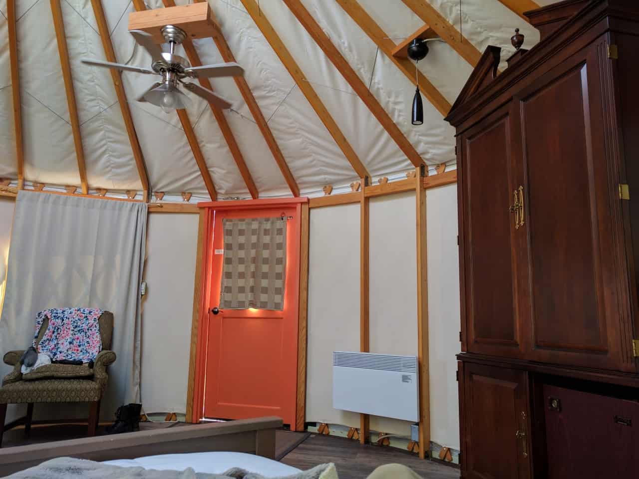 The inside of our yurt was pretty amazing, our yurt had a 20′ diameter, giving us 315 square feet of living space. The yurt felt very spacious, which is enhanced even further by the high ceiling. Our yurt included wood floors, a king size bed, a small bathroom with a toilet and a stand up shower, and a sink was located just outside the bathroom next to the coffee/tea serving area and the microwave. There was also a small seating area with two chairs.