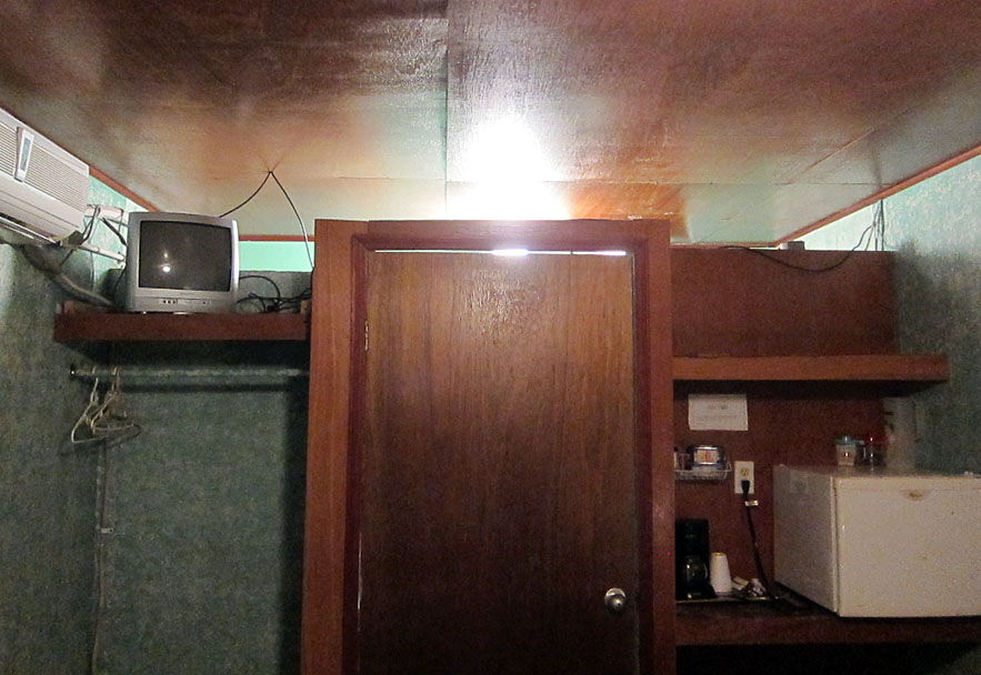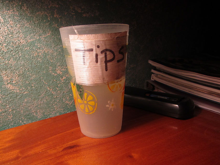 Now, I usually like to end my reviews with a few token bits of positive qualities, but I think I made a mental note to forgo that after I saw the in-suite tip jar, or the note proclaiming that the accommodations include FREE RAIN WATER! Gee golly, how can you beat that? Excellent value if you ask me. A person could use that to help wash down a cyanide capsule after spending a night here.