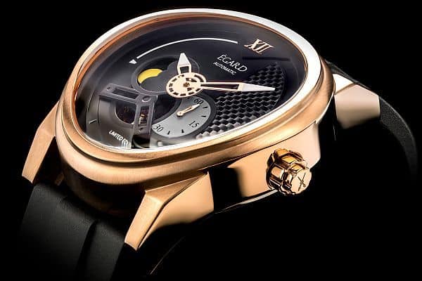 The watch comes in a combination of oval/triangular/round-ish shape with a curve to it, which should help it sit comfortably on the wrist. The dial is very clean and the background is half black and half carbon fiber, it works in this application. There are two main hands on the dial for the minutes and hours which are coated with SuperLumiNova lume, so you should be able to tell time in the darkest corners of the universe. The dial features 2 sub-dials for the seconds counter and the sun/moon AM/PM indicator, the disc for the day/night indicator is coated in asteroid dust, taking this watch out of this world. There’s also a small window peeking into the movement and a power reserve indicator located between 9 and 11 o’clock position.