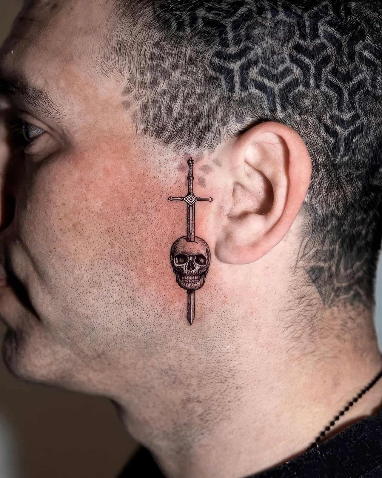 Skull motifs in face tattoo art speak of life’s fleeting nature and a rebel spirit. Artists craft these designs in many styles, from lifelike to symbolic. A skull tattoo on the face makes a bold statement.