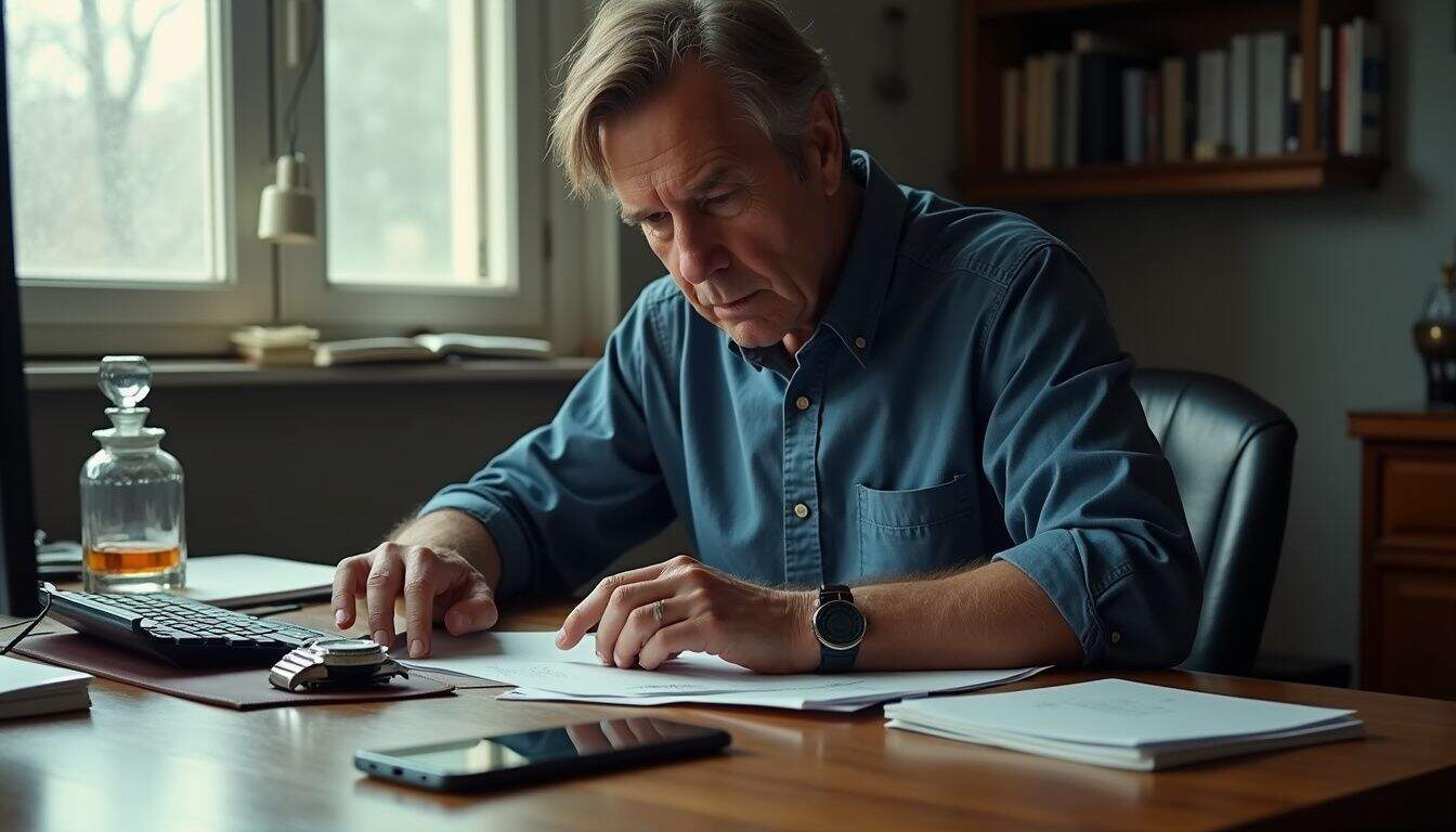 A middle-aged man sits at a cluttered desk, looking frustrated while hovering over a keyboard amidst scattered documents.