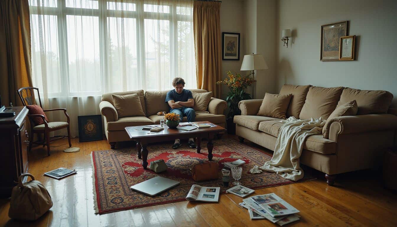 A luxurious yet cluttered living room features a relaxed individual amid expensive furnishings and scattered belongings.
