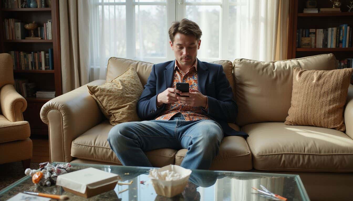 A casually dressed man sits in a cozy room surrounded by luxury items, exuding a sense of calm and contemplation.