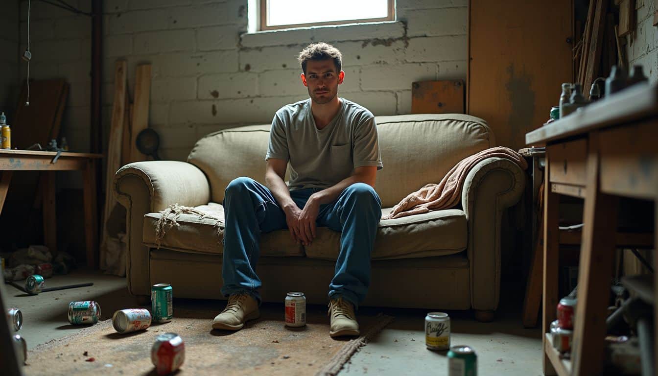 A casually dressed man sits on a worn sofa amidst a cluttered, unfinished basement filled with debris and tools.