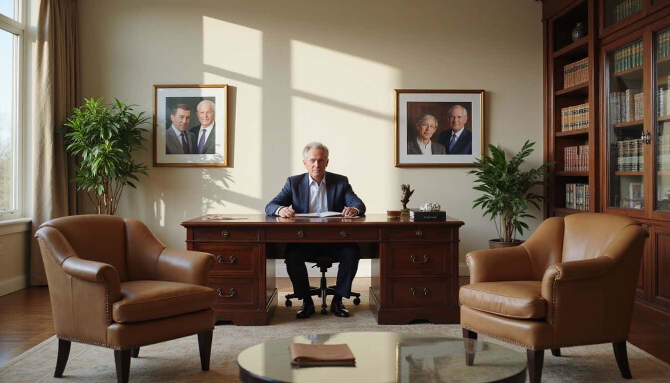 A polished executive office features a mahogany desk, plush armchairs, family photographs, and tasteful decor, reflecting professional success.