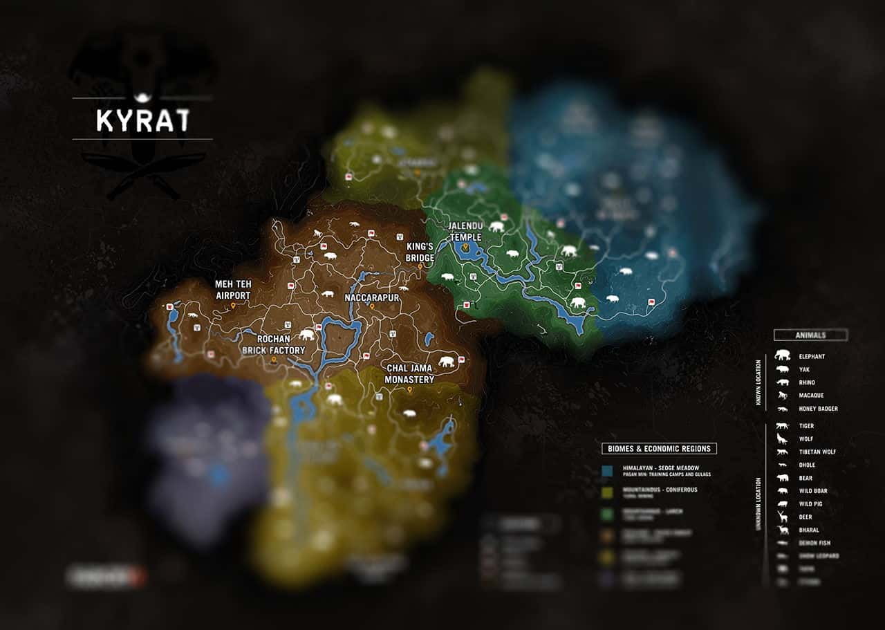 As of the publication of this article, the release of Far Cry 4 is imminent. If you’re reading this afterwards, that’s fine too, because what I’m sharing with you is the final, complete map of Far Cry 4’s fictional region of Kyrat. This complete Kyrat world map shows the locations of all the radio towers, outposts, fortresses, and important locations. It also shows the regions that each of the game’s many animals are found, and of course… the names and locations of the many towns and cities scattered across Kyrat.