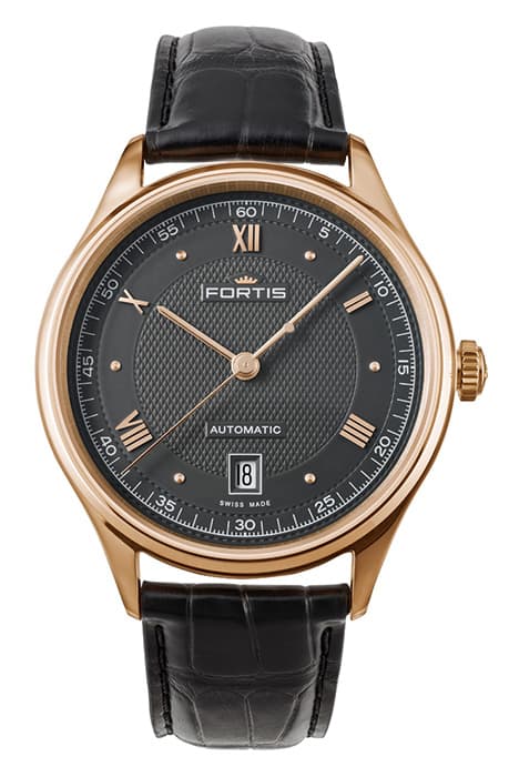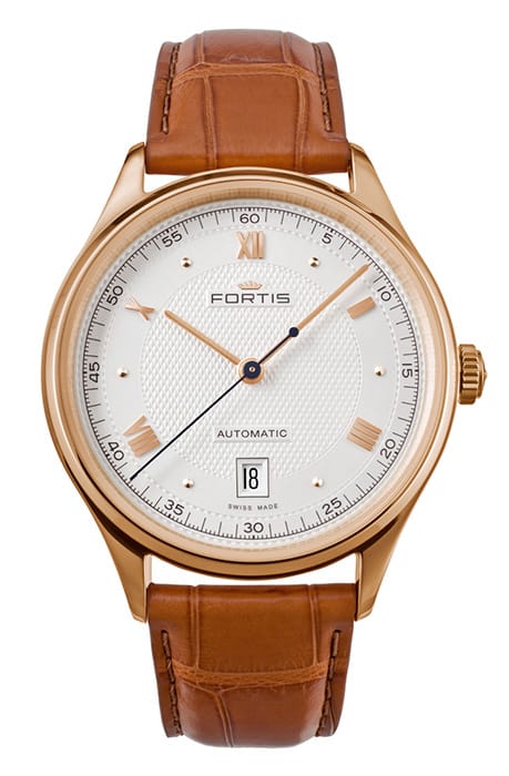 All four versions of the Fortis Terrestis 19Fortis watches come with rose gold raised Roman numerals and hour indices and Arabic numeral minute markers. The hour and minutes hands are also rose gold while the second hand is finished in blue on the a.m. version. The dials have a very elegant look to them, described by the watchmaker as “The pleated texturing of the dial cites a sharp, pressed tuxedo shirt, which makes the 19FORTIS the perfect accessory for the modern gentleman.”