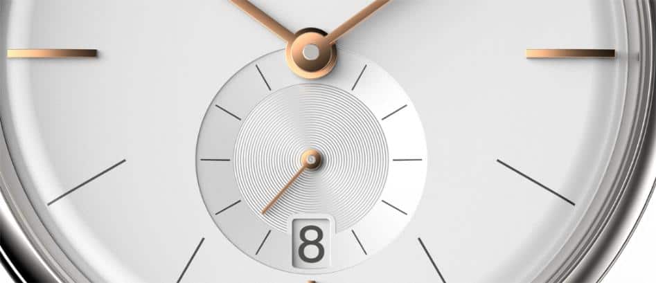 The watches come in 40 mm stainless steel or rose gold cases with black leather straps and steel or rose gold buckles. The dials are domed and come in black (anthracite) or silver opaline, covered with AR coated domed sapphire crystal, the same crystal is applied to the display caseback. The dial features a sub dial above the 6 o’clock position for the seconds display, which also houses the date window. The three hands, three indices, and the Arabic numeral 12 are all finished in rose gold.