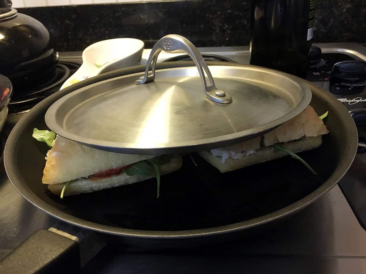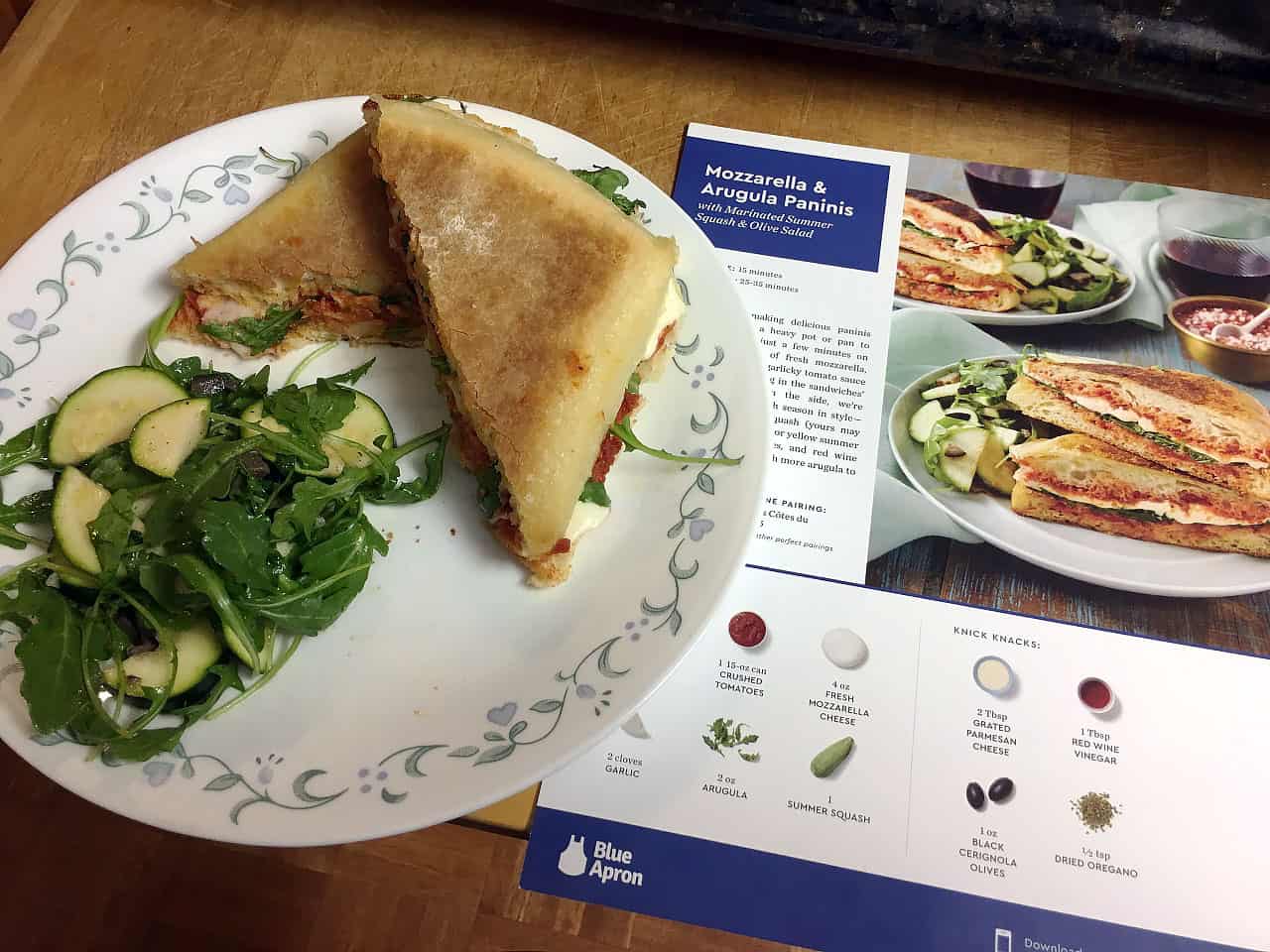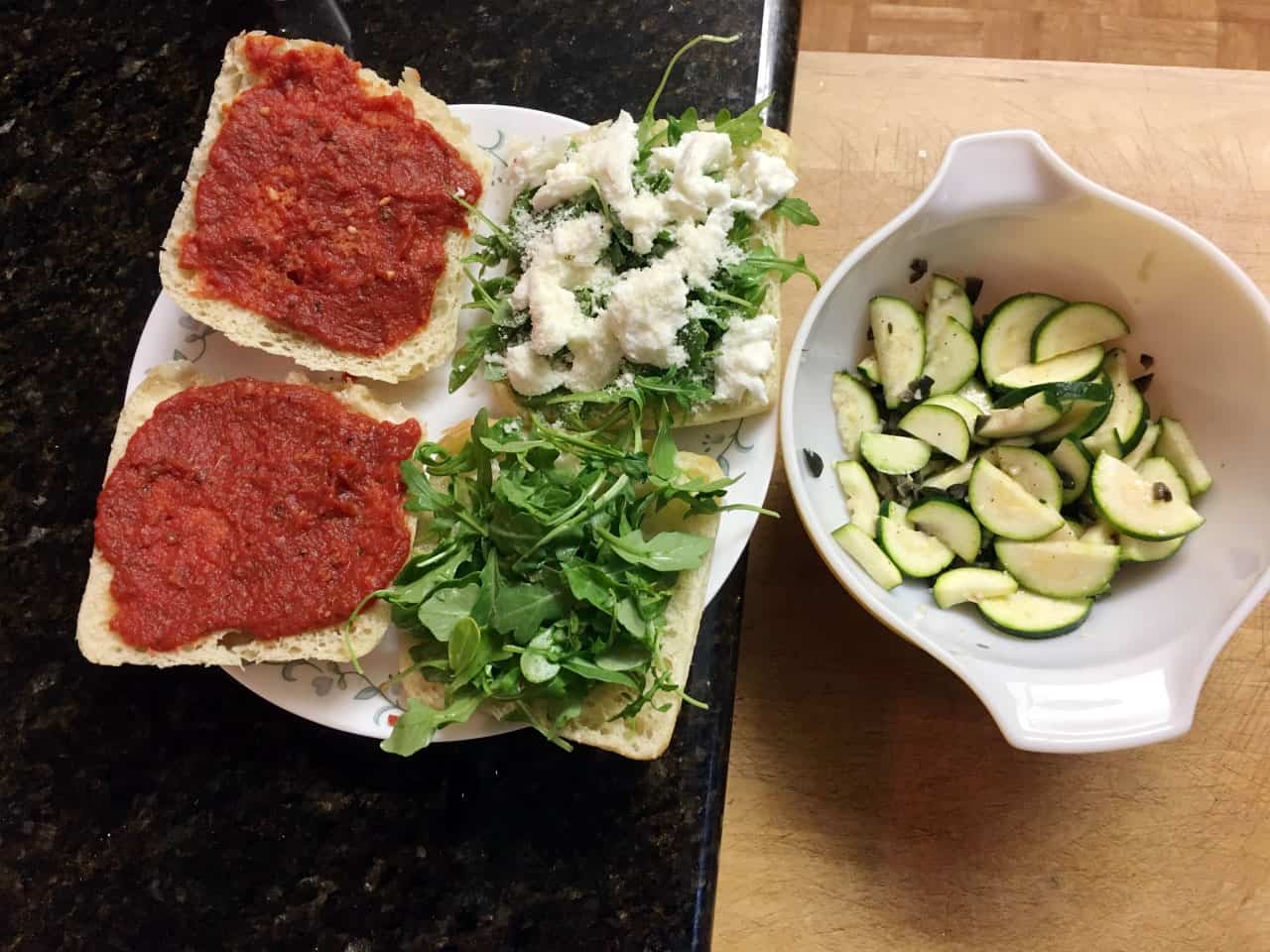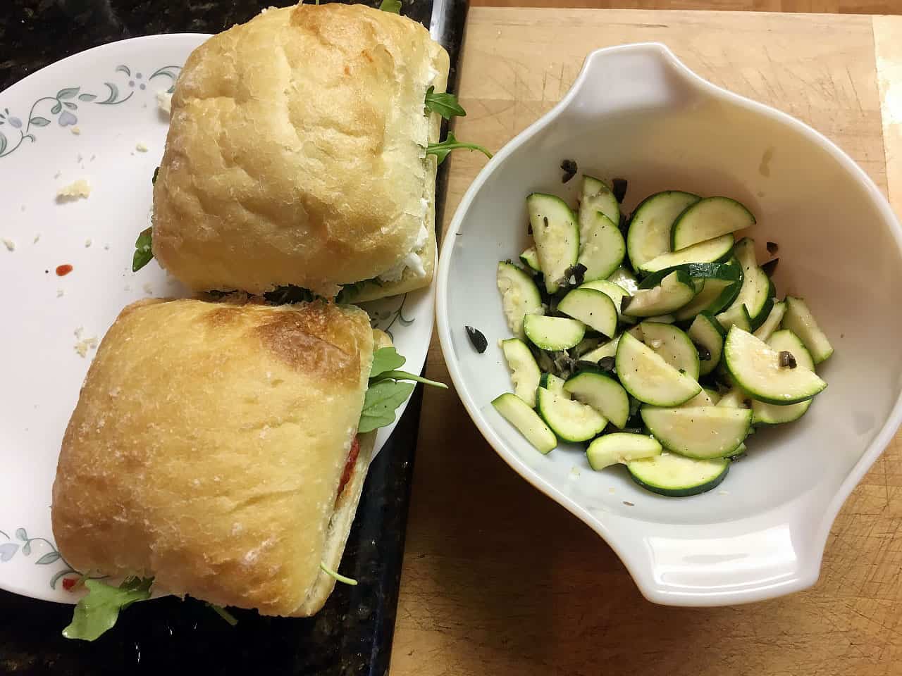 The next night, I got home a little late. My wonderful boyfriend had already started cooking our next meal (proving that he’s definitely a keeper): Mozzarella and Arugula Paninis with a fresh Marinated Summer Squash and Olive Salad. This is a guy who’s idea of cooking is opening a can of Chef Boyardee, but he really had fun following the recipe. The result? Warm and melty paninis with a crisp and delicious salad.