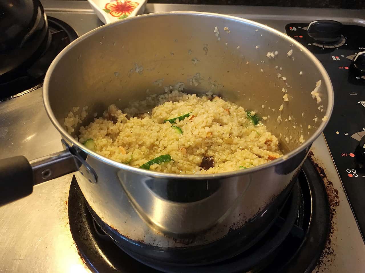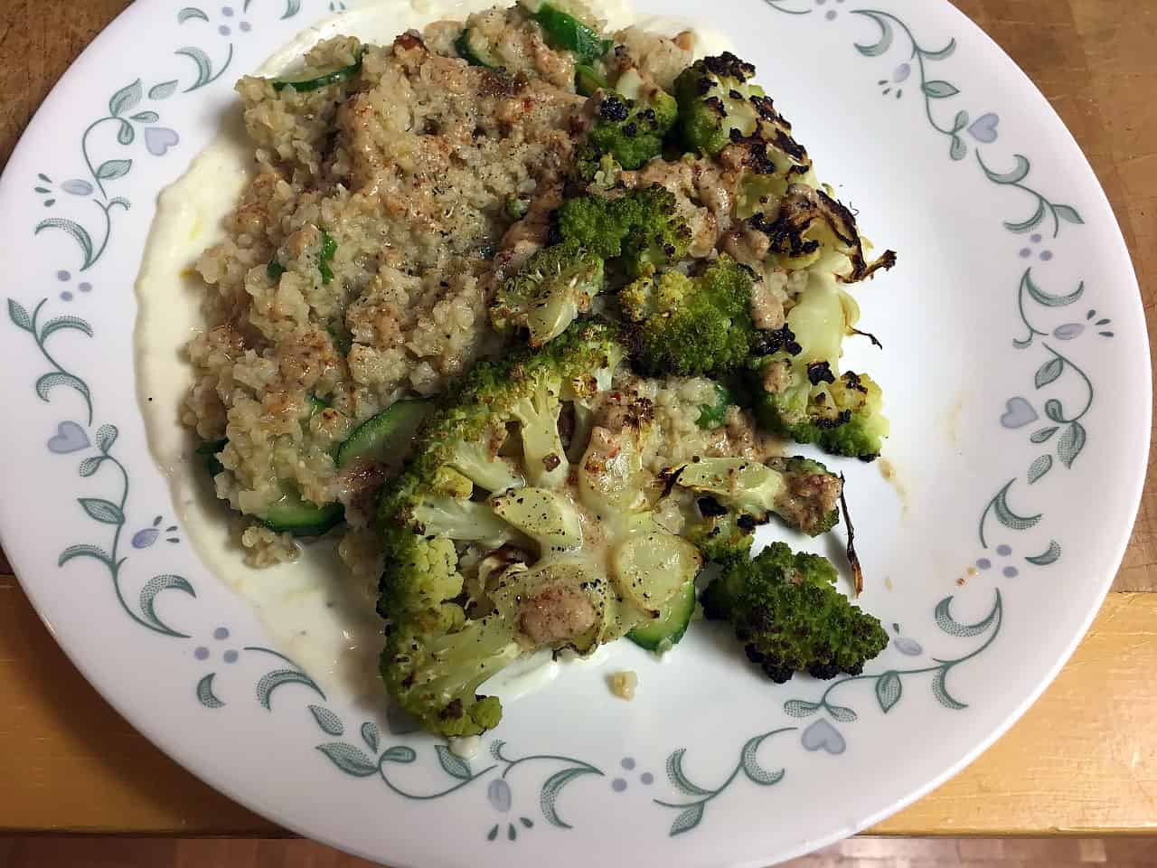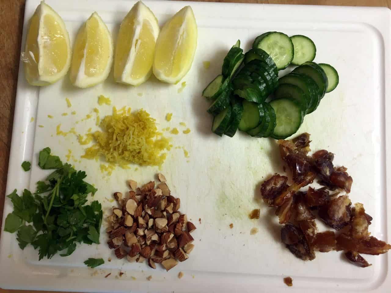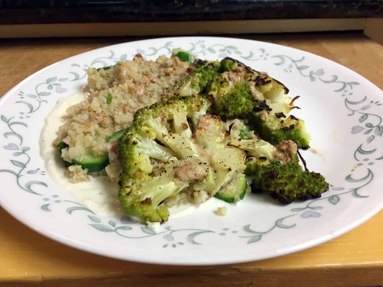 We skipped the following night because we had plans to dine out with friends. The night after, we settled down to make the final Blue Apron meal in our box: a Roasted Cauliflower and Freekeh Salad with Lemon-Yogurt Sauce and Spiced Tahini Dressing. I had never heard of freekeh and thought it sounded, well, freaky. For those who are also new to this mystery ingredient, it turns out that freekeh is a young-harvested wheat that’s toasted. It made a truly tasty base for the salad, which was topped off with roasted cauliflower, roasted almonds, dates, cucumber, and addictive yogurt lemon sauce (this stuff would taste great on everything) and spiced tahini dressing.