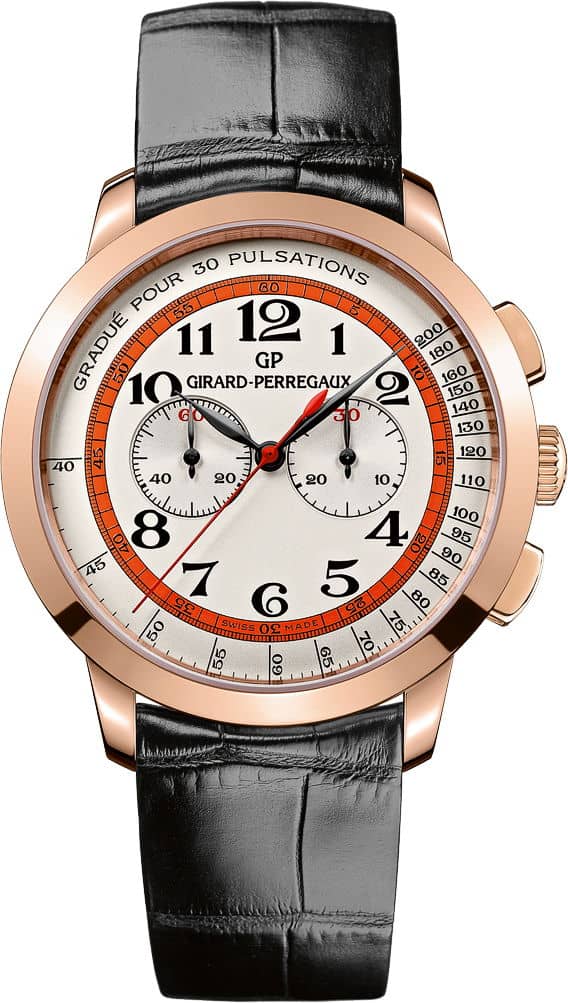 Girard-Perregaux has produced a few other “1966 Chronograph” watches; the difference in the Doctor’s watch is the addition of the pulsometer scale and the addition of the orange ring on the dial, with the seconds. The watches come in 40 mm cases and feature AR coated sapphire crystal on the front and sapphire display case back, with alligator leather straps. The watches are powered by in-house caliber GP030C0 automatic movements with 30 hours of power reserve and are water resistant to 30 meters.