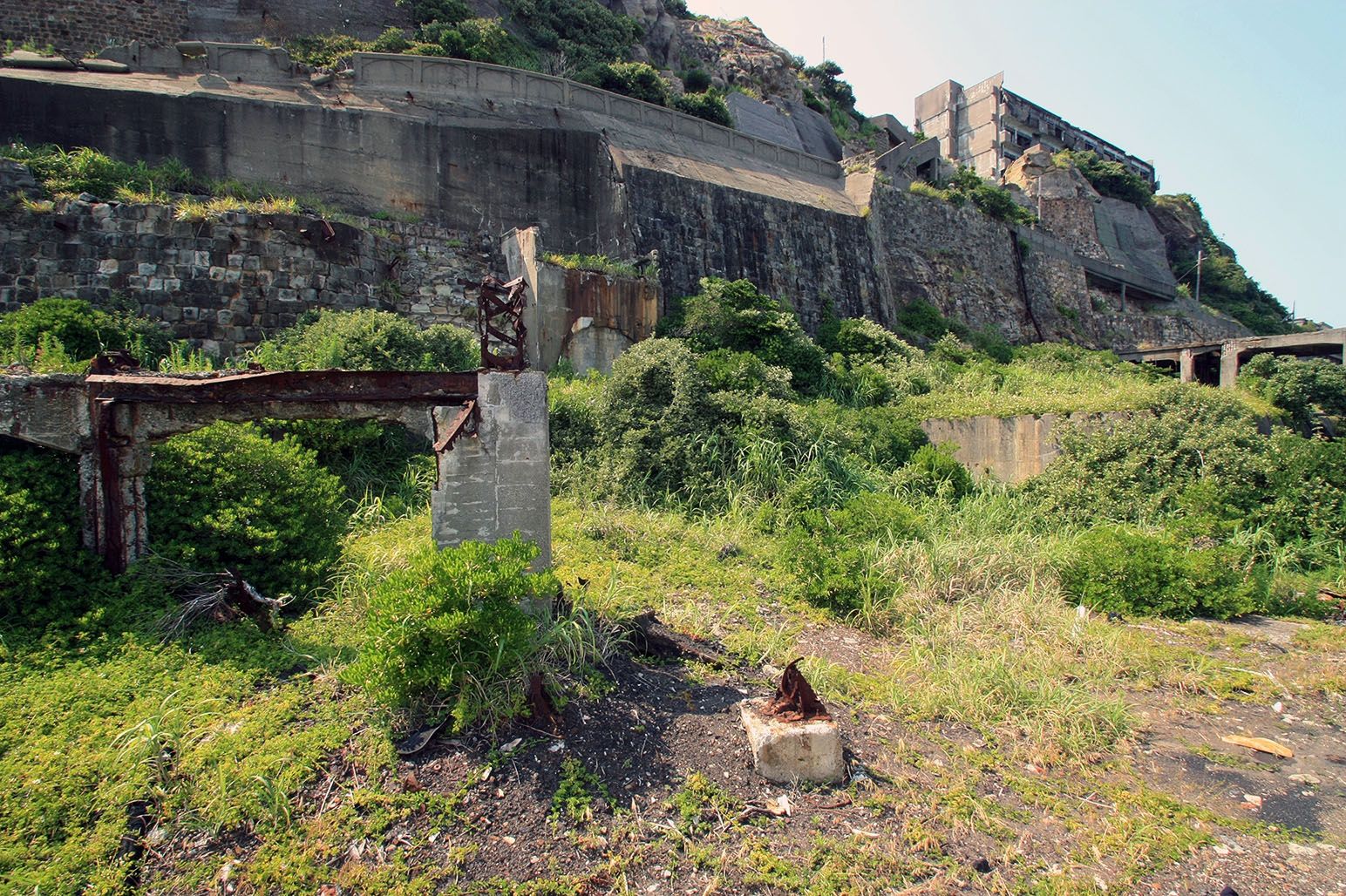 This looks a lot like a WW2 battlement to me. Like everything on Hashima, the island is slowly reclaiming this building. Perhaps the island will one day be home to a wide range of birds like on Alcatraz.
