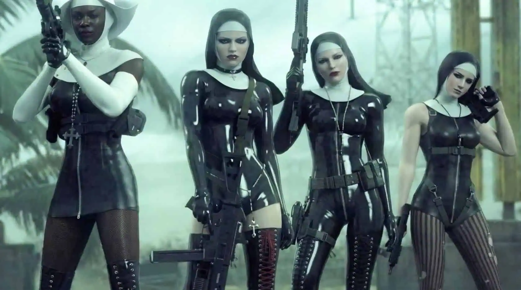 - Religious imagery: nun visuals are instantly recognizable, so they hit harder than generic tactical gear.