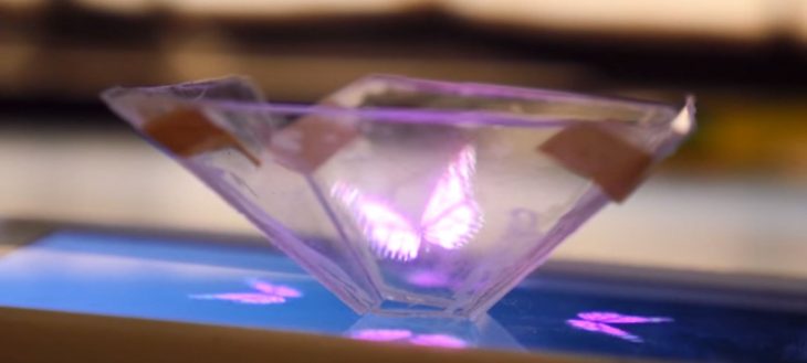The pyramid actually has four sides, because rather than having a tip, it’s flat so it can rest of the screen. Using mirrors, this device is able to take what is being shown on your smartphone screen and project it into the black pyramid, so when the lights are off, all you can see is this awesome hologram that seems totally real and 3D right in front of you.