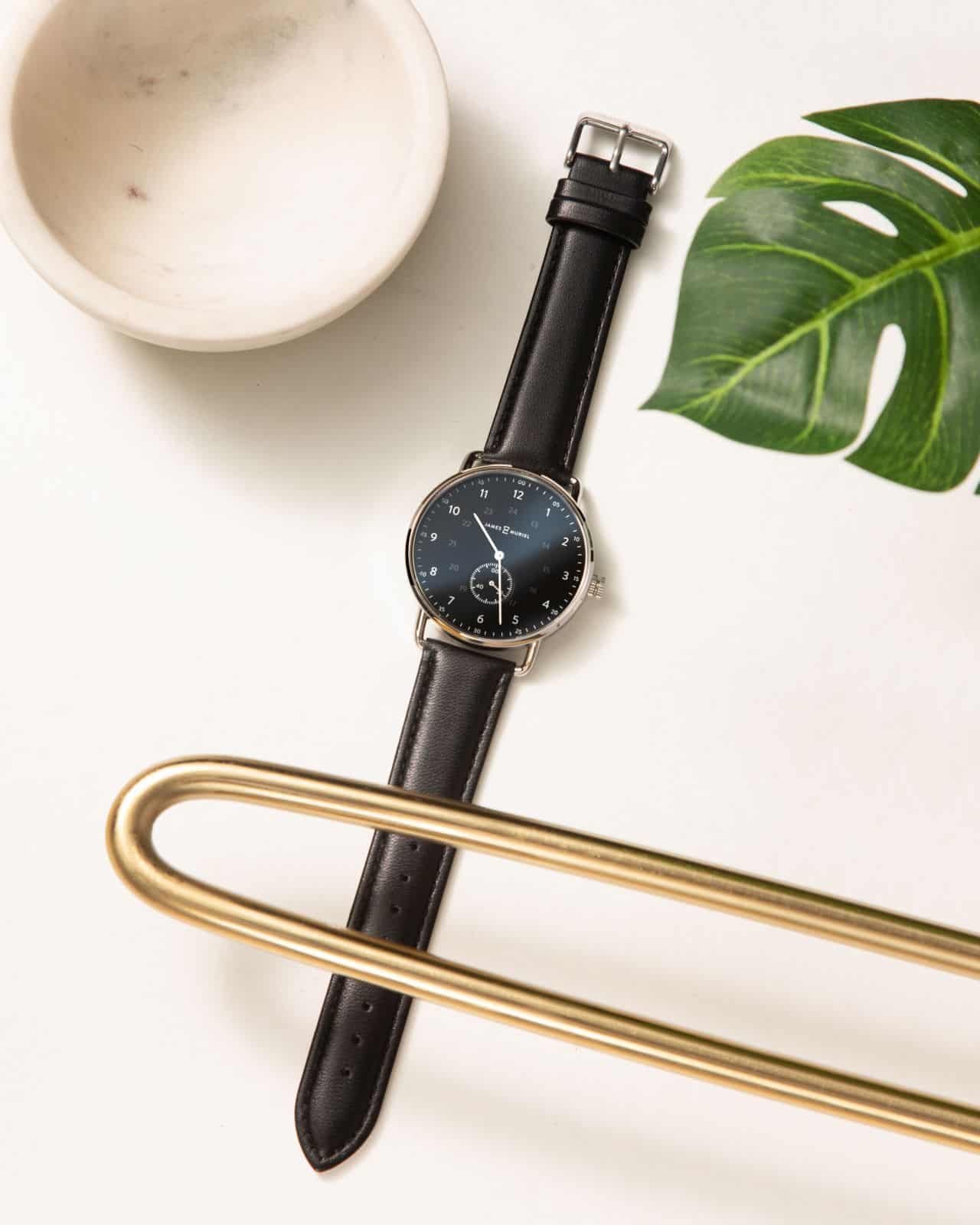 This stunning watch is sure to turn heads and is available in three colors – silk white, dreamer’s black and horizon blue. The silk white has pops of color on the hour, minute, and the seconds hands catching your eye each time. The dreamer’s black features an all black dial with white baton hands, giving a it a professional look. The horizon blue is the most vibrant with a beautiful blue dial, orange 5-minute markers and a bright orange small seconds.