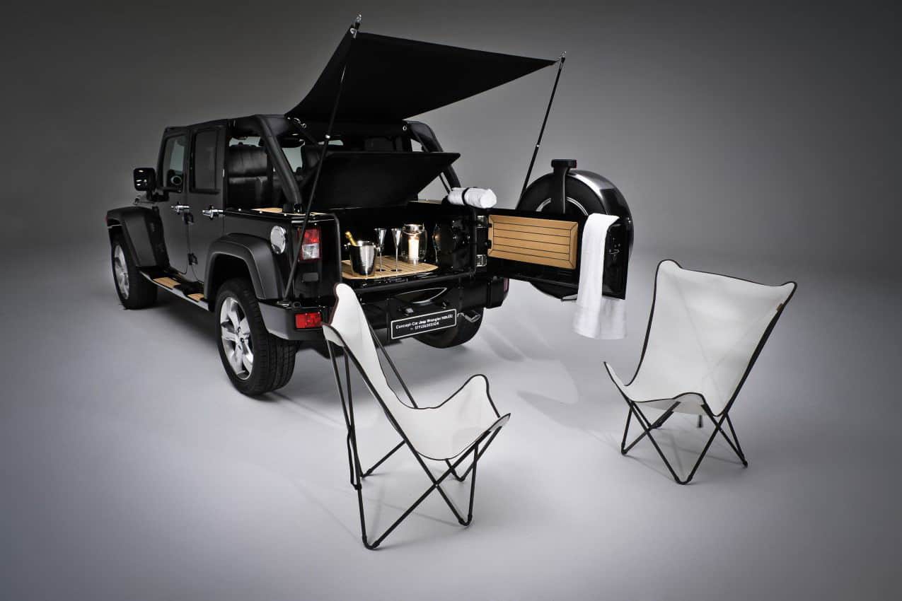 The Jeep Wrangler Nautic Blanche’s design is inspired by a sailboat and features an all-white exterior with chrome 20 inch wheels and chrome grill, door handles, gas cap, and trunk hinges. The interior is quite luxurious and features while leather and wood trim. Unlike the Defender Yachting, the concept Wrangler doesn’t have wood floors instead it uses regular carpets that have the look of wood. The Wrangler also comes with a small tent for shade and a pair of white canvas chairs.