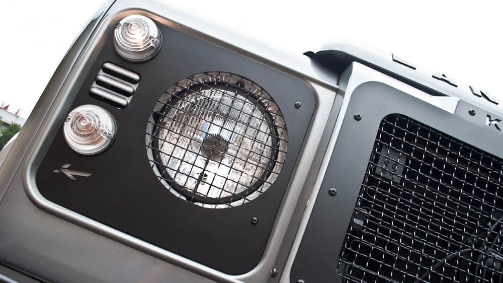 The exterior upgrades are minimal with the main standout being the mesh grill and mesh headlight protectors. The Defender XS 90 is painted in Orkney Grey color with matte black paint on the side steps, front and rear bumpers, mirror caps, and the 18” Khan Design wheels.