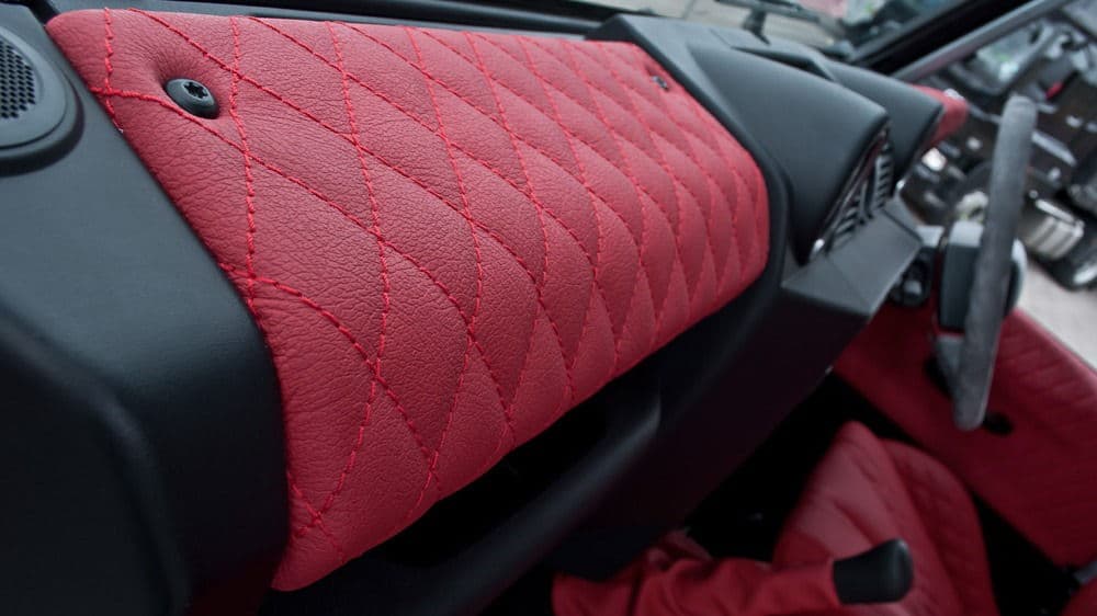The interior is where most of the magic happens with red leather covered sports seats with contrasting stitching. The same leather material is also applied to the door panels, arm rests, headliner, and parts of the dashboard. The gauges have a red background with white numbers and the steering wheel is covered in grey Alcantara.