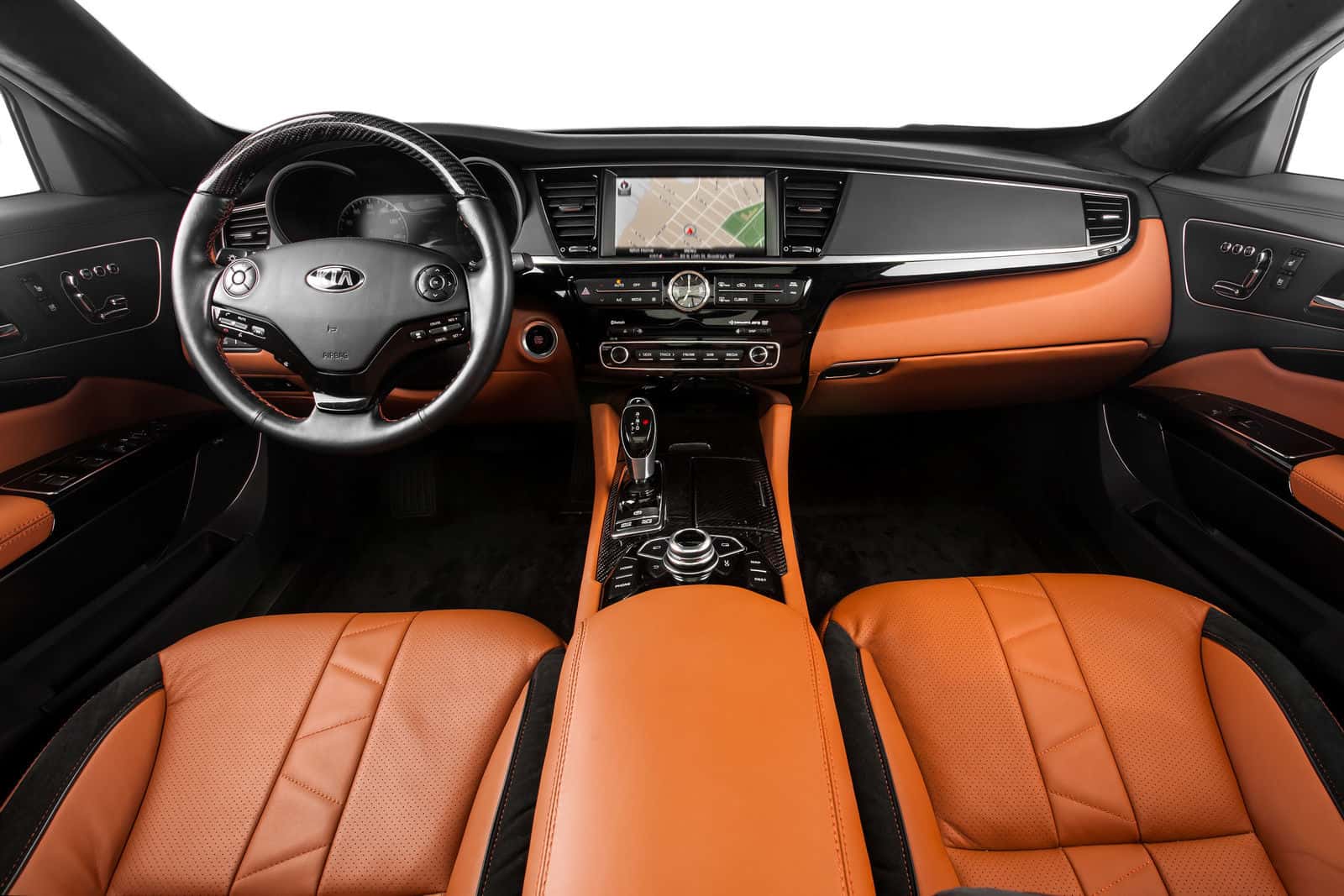 The stock Kia K900 features a 5.0-liter V8 producing an impressive 420 horsepower but when you’re at a major car show, 650 horsepower is need to turn heads. Yes, this K900 has 650hp thanks to the Garret 2871R twin turbo setup which is located at the rear of the vehicle under the trunk. To complete the package, Eibach suspension and Ksport 8-piston brakes are paired with 15-inch cross-drilled rotors. The interior of the Kia K900 is already luxurious but this particular example gains tan leather seats with black suede accents, carbon fiber trim, and 11-inch monitors for the rear passengers.