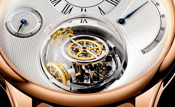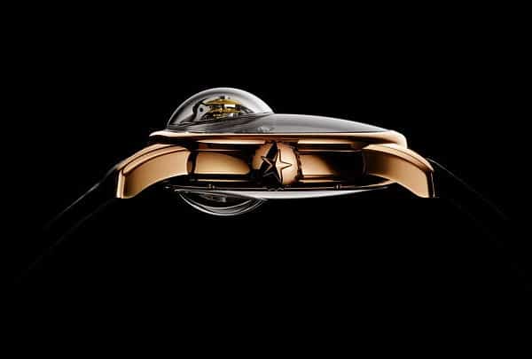 The hour and minute sub dial is placed above the glass globe at the 12 o’clock position. On the right side, at the 3 o’clock position, sits the 50-hour power reserve indicator and on the left side is the small second sub dial.