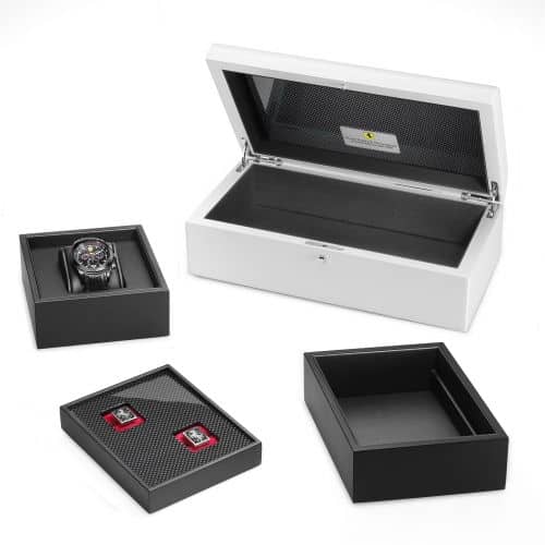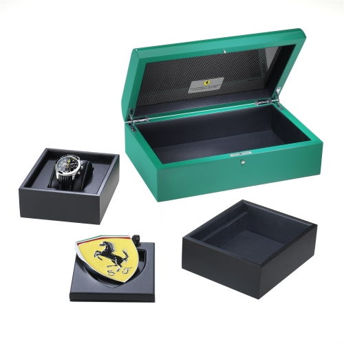 The green lacquered box comes with a silver chronograph watch with a black face and a black strap. The exclusive item for this box is a paperweight that is shaped like the Ferrari Shield (the shield is around $10,000 option on Ferrari cars) and has a shiny finish to it. The white Ferrari Paddock Chronograph box comes with a black cased watch with a black strap. The exclusive item for this box is a pair of cuff-links with the Ferrari prancing horse enameled on them. The red box comes with a silver cased watch with a white face and a brown strap. This box includes a silk Ferrari jacquard.
