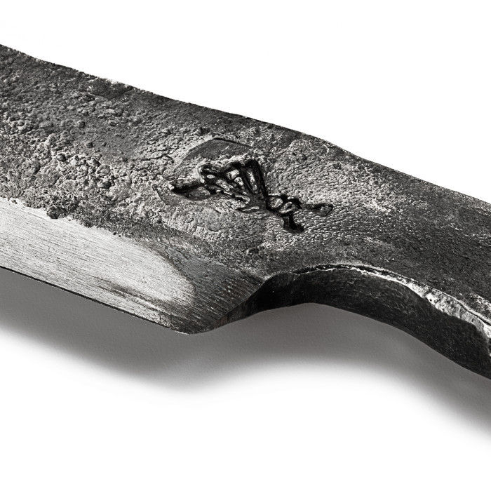 This close up shot of the knife shows off the pits and craters caused by the forging process. You can also clearly see the logo, which looks like a man having sex with a tree. This symbolizes mans’ connection with nature, and his iron will to survive.