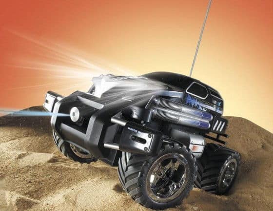 This RC Car is like no other and features a hidden water gun and functional flashing Xenon lights. The two-speed turbo RC car is capable of going up to speeds of 11 mph (when turbo is used) and features advanced battery technology that allows it to run for 40 minutes on a single charge.